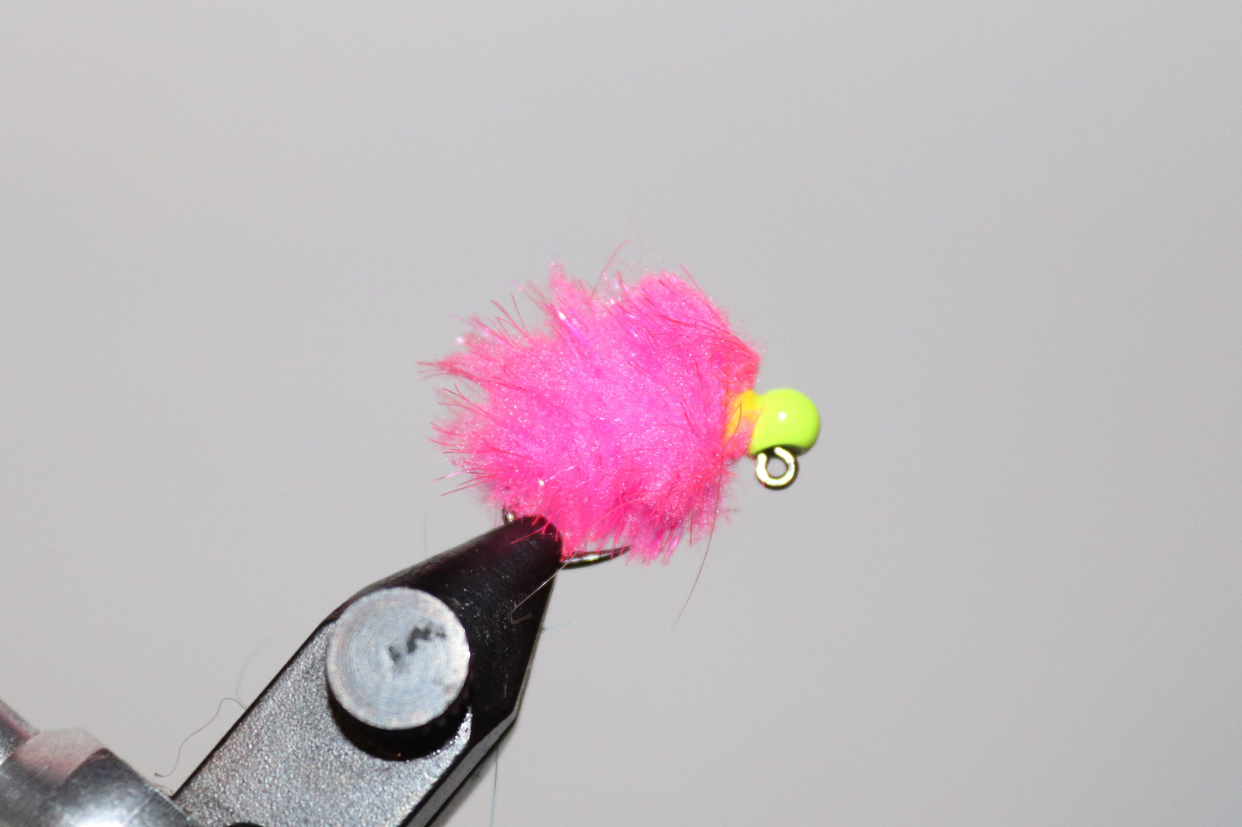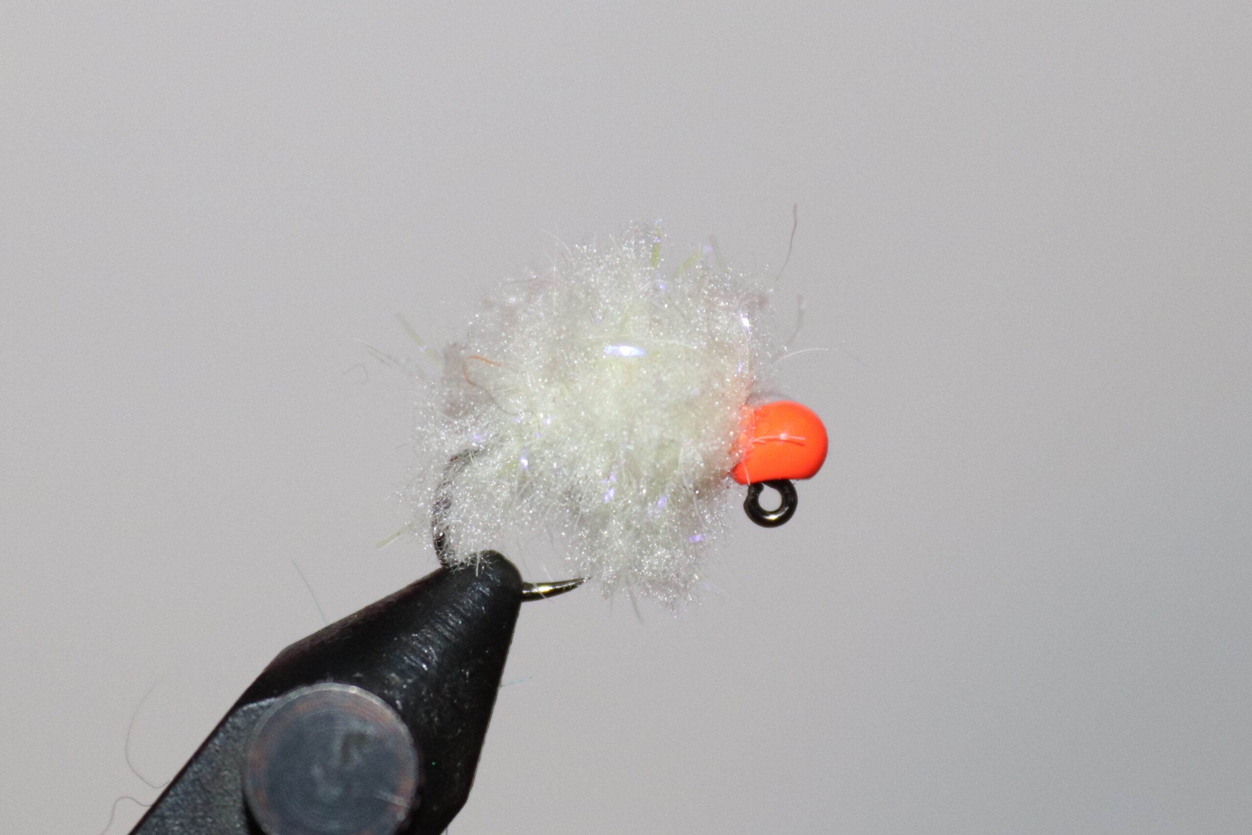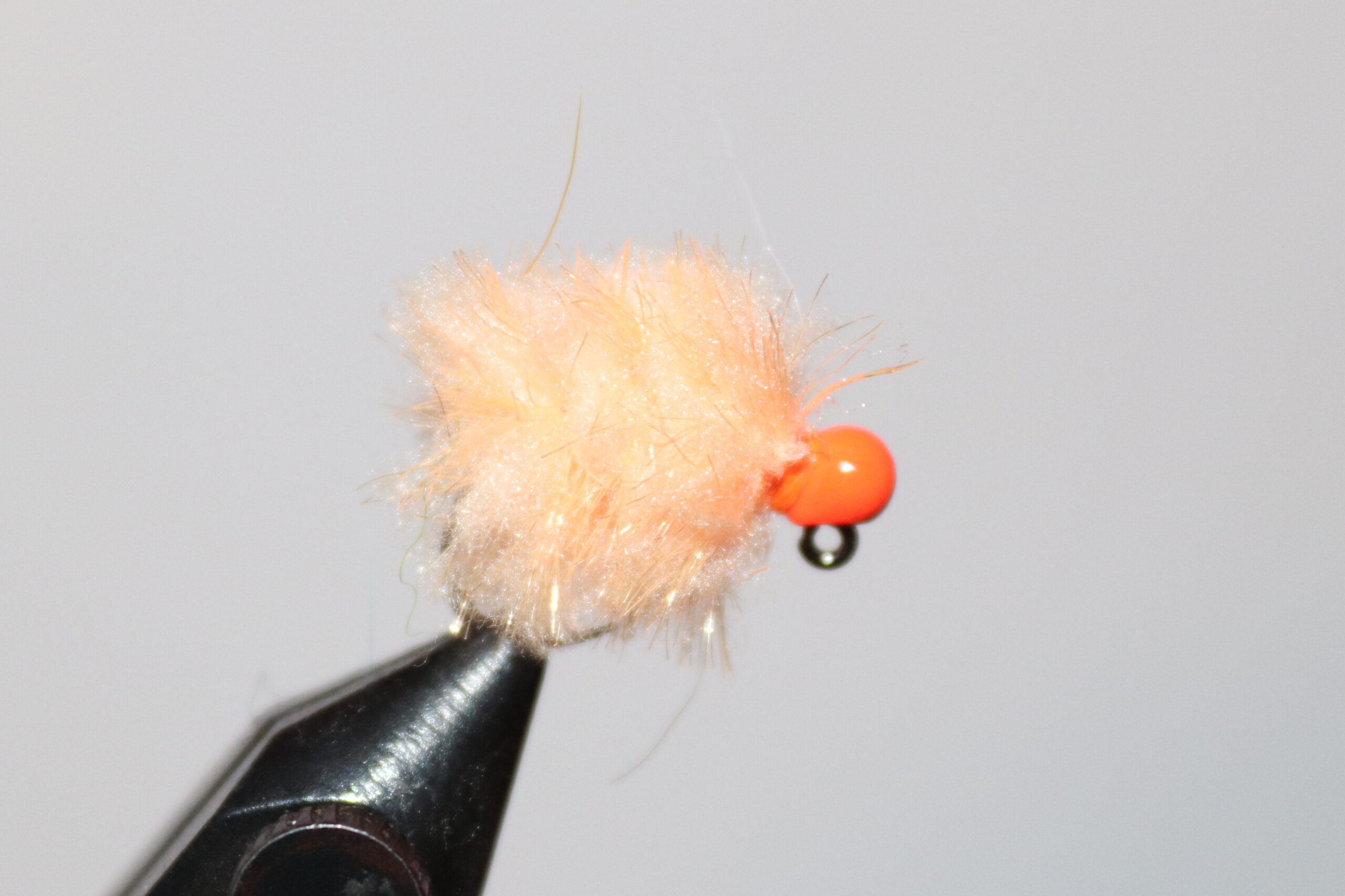 This fly is commonly tied on a size 10, 12, or 14 hook with a tungsten bead to sink faster than a traditional bead. The main material used, called daphnia fritz, is wrapped tightly around the shank of the hook and tied off just behind the bead. Colors can range, but the go-to colors are peach, apricot, bright green, pink, and red.